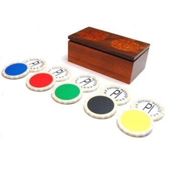 EFFECT: The performer shows the audience two sets of five Colored chips. These will be used in a Psychic experiment involving one of the spectators. The twist is, the spectator will be able to 'read the performer's mind'!