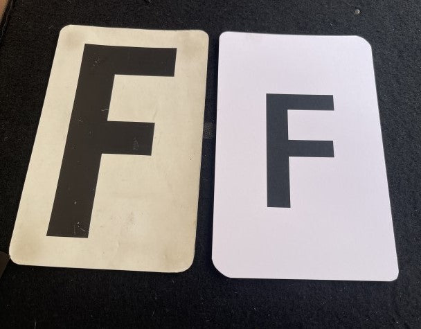 F CARD NOITE: This card is used to go from an E to an F on the tabletop.. The photo shows the larger force F that goes on the table next to the one in the alphabet deck.