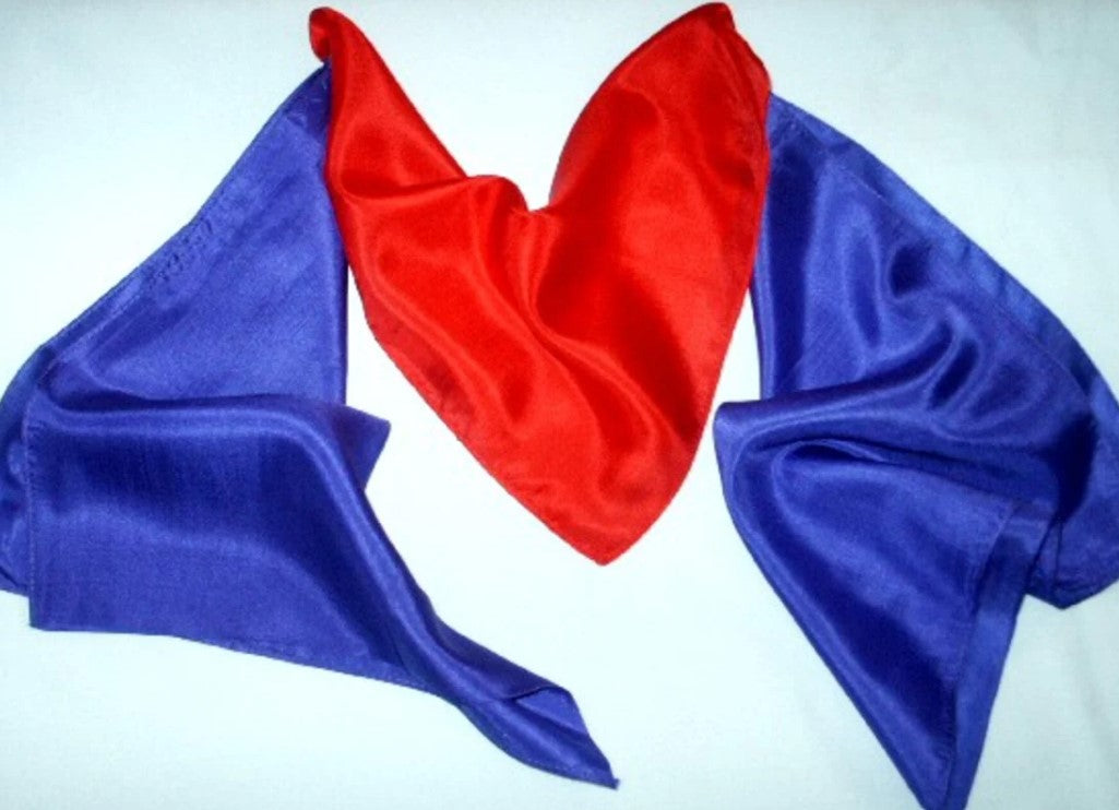 The magician ties two blue handkerchiefs together and sets them aside. Then, the red silk is vanished. Upon examining the blue silks a second time, the missing red silk is seen to have appeared tied between them.