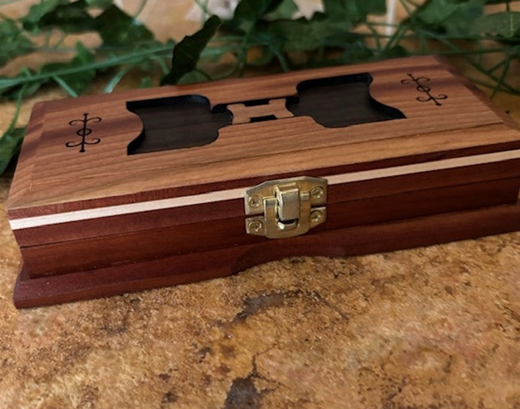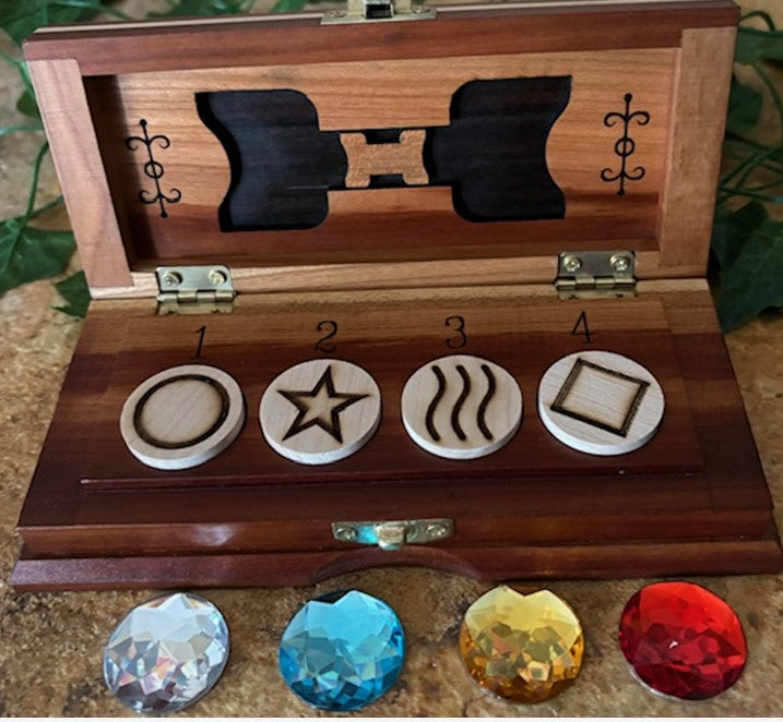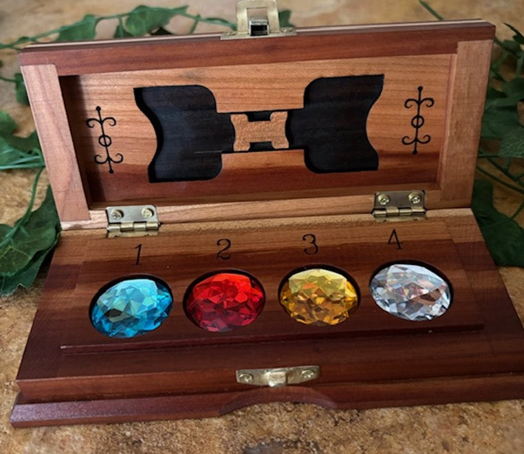 The chest is hand-crafted of European Plum wood. with delicate engravings inside and out. There are no electronics used, nothing is added or taken away. The unit is 100% self-contained. Supplied with the necessary jewels plus four ESP disks for an alternative routine. Supplied with wonderful patter and complete instructions. May be examined without fear of detection.