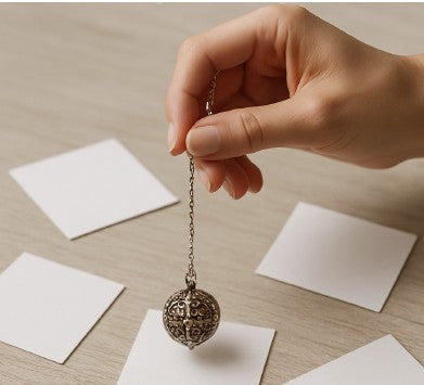 The gleaming pendant, transformed into a mystical divining rod, is gently suspended above each card in turn. As the pendant passes, an almost imperceptible vibration stirs over one card, while the others remain eerily still. That singular card, separated from the rest, continues to draw the pendant’s subtle energy, as if guided by unseen hands. Finally, cradled between the performer’s palms, the hidden card radiates with a delicate movement from the pendant hovering above. When at last it is unveiled, the name of the dearly departed is revealed, as if whispered by the spirits themselves.