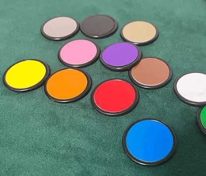 Twelve different colored chips are shown to be the same color on both sides and are laid out on a clipboard. While you look away, an audience member randomly chooses one chip and flips it over. You then empty all the chips back into the bag and are able to correctly guess which chip was chosen.