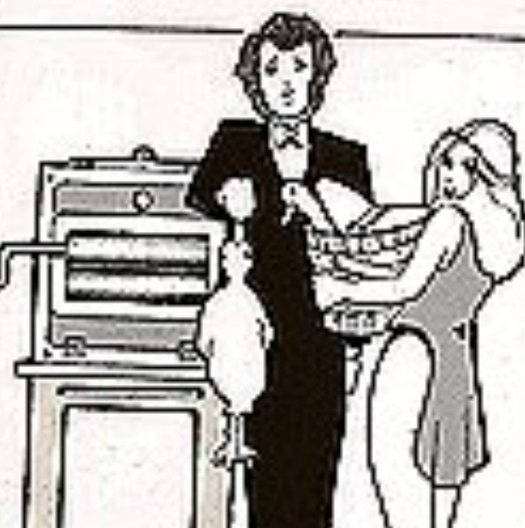Next, the ducks are placed into a small box and the lid is closed. A few magic words and, BAM! The box is taken apart piece by piece and stacked flat on a side table. The ducks have vanished! Visual stage magic at its best!
