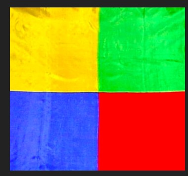 The magician shows the audience five silk hanks: red, yellow, blue green and white. The white silk is tied around the others, then untied and set aside.